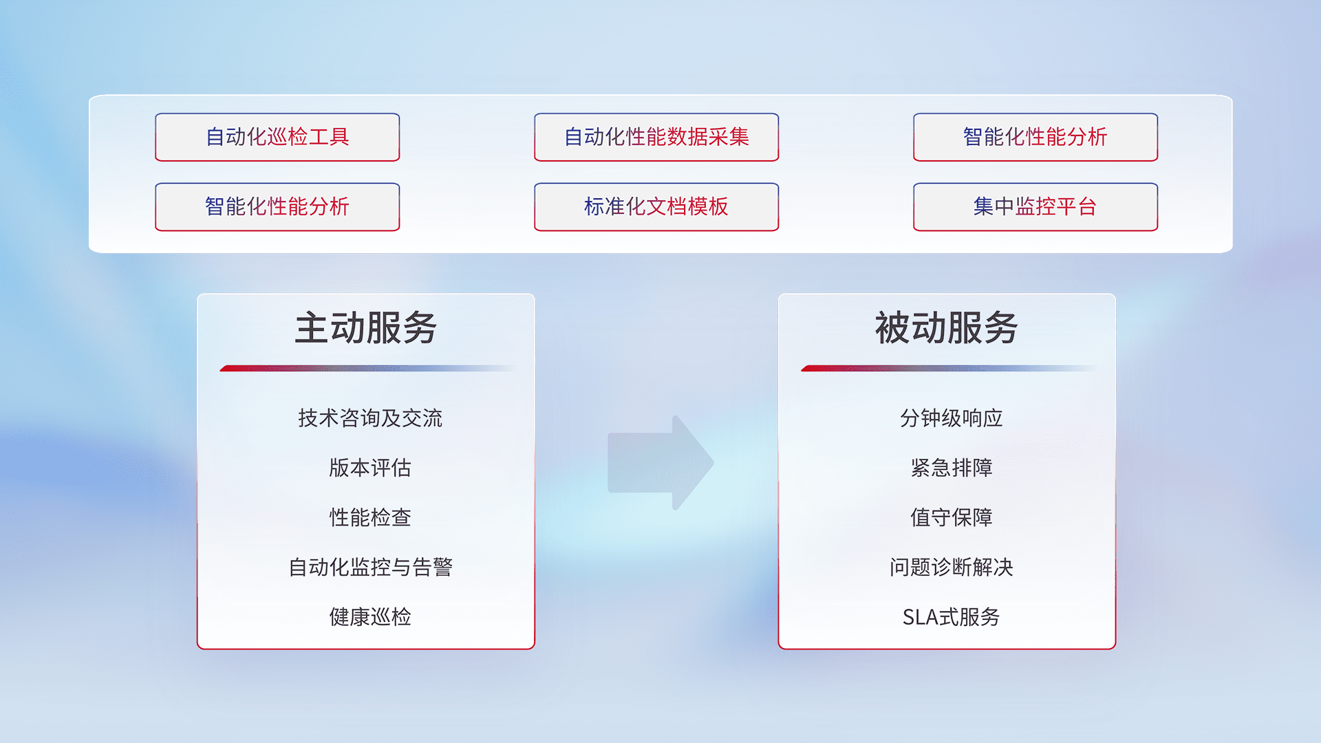 智能化工具和标准化文档,,保障服务质量,,,提供主动服务(包含技术咨询、、、版本评估、、性能检查、、、、自动化监控与告警、、健康巡检)和被动服务包含(分钟级响应、、、、紧急排障、、值守保障、、、问题诊断解决、、SLA服务)。。